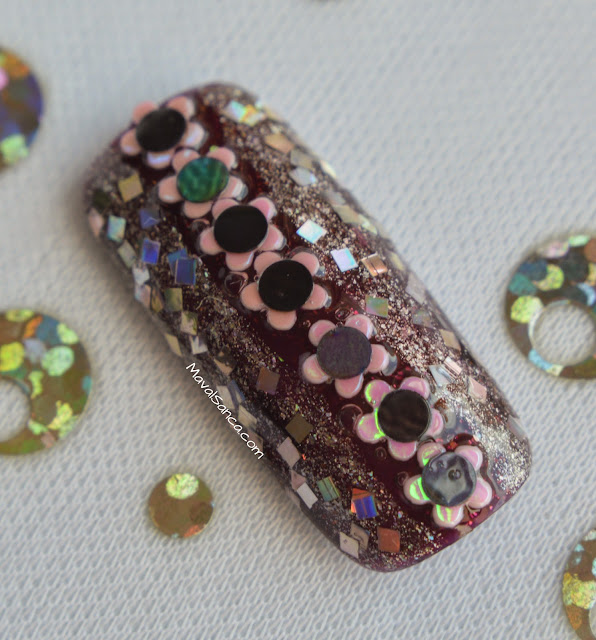 I applied in center pink holographic flowers and on the center of each one a black circle.