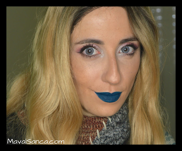 En los labios llevo un labial líquido fijo y mate en color azul turquesa oscuro.